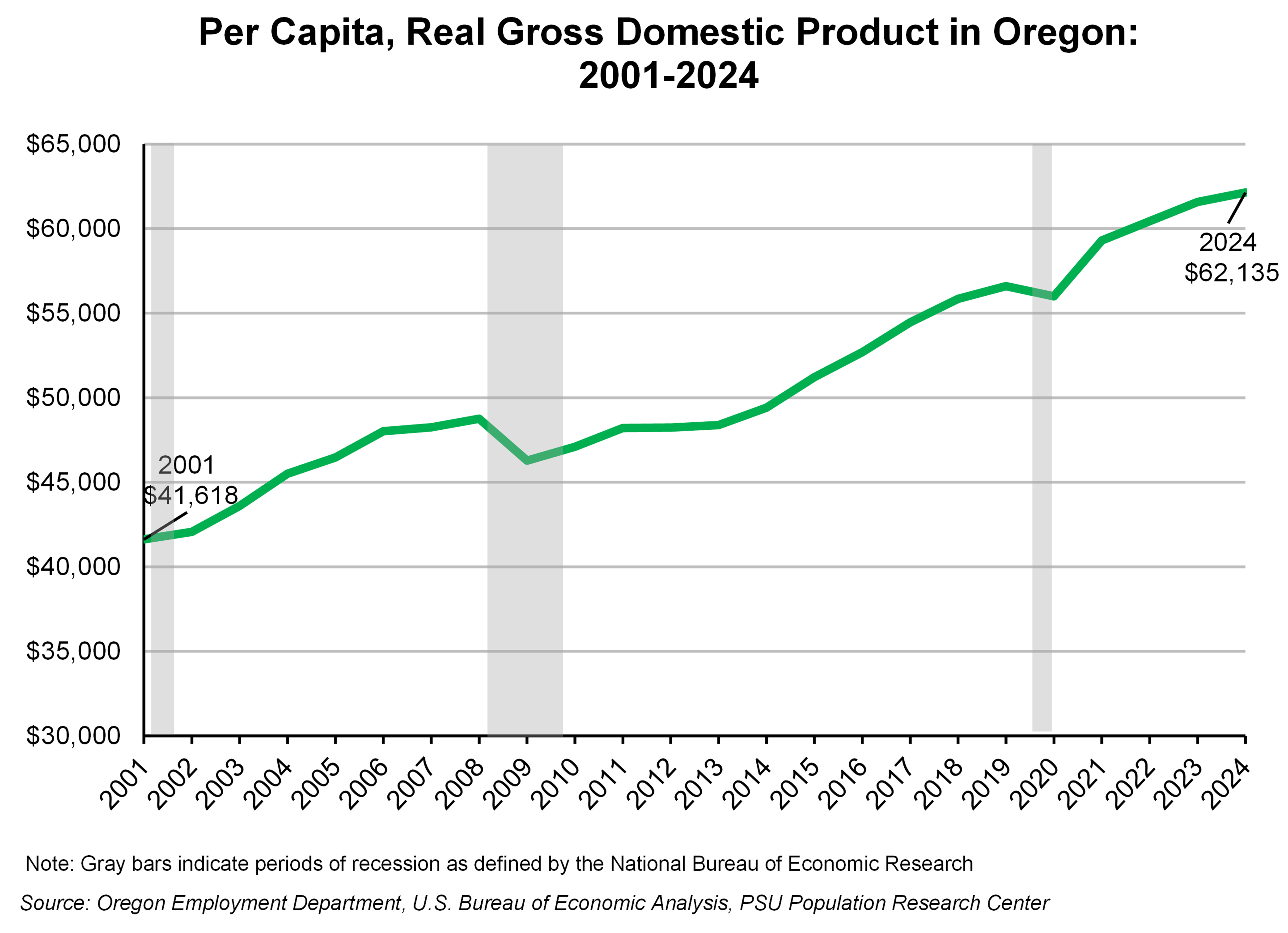 Oregon’s per capita real GDP rose from $41,618 in 2001 to $62,135 in 2024 – increasing by 49.3%. Most of this period saw Oregon’s per capita GDP increase year-by-year, except for the two recessionary periods during the years 2009 and 2020.