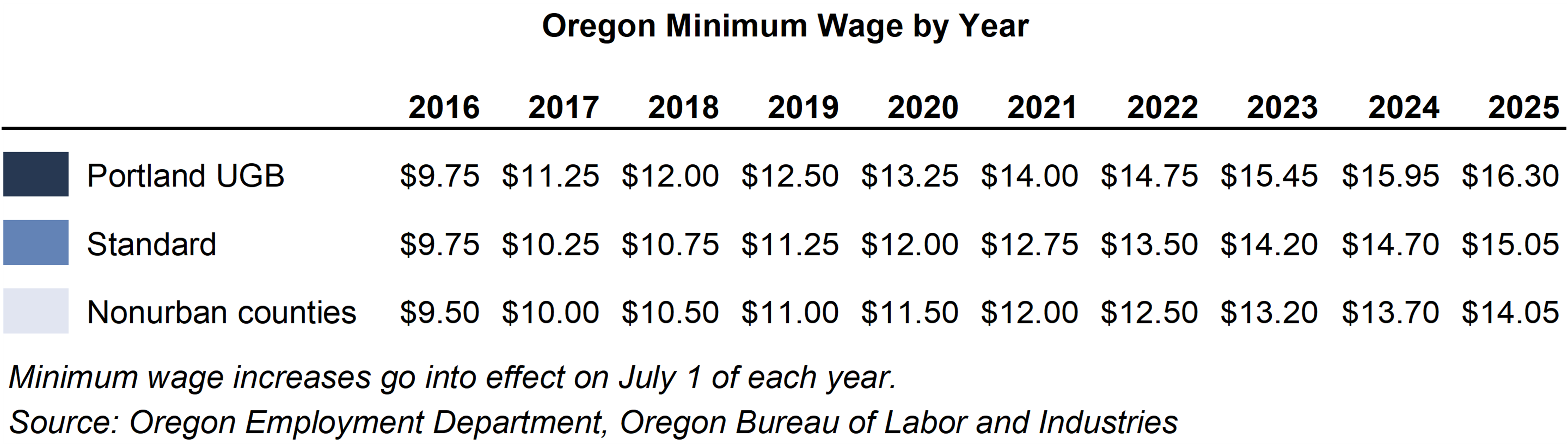 Oregon’s minimum wage increases on July 1, 2025 and the raises will not be the same across the state. The minimum wage increases to $16.30 per hour inside the Portland urban growth boundary, $14.05 per hour in nonurban counties, and $15.05 in other areas of the state.