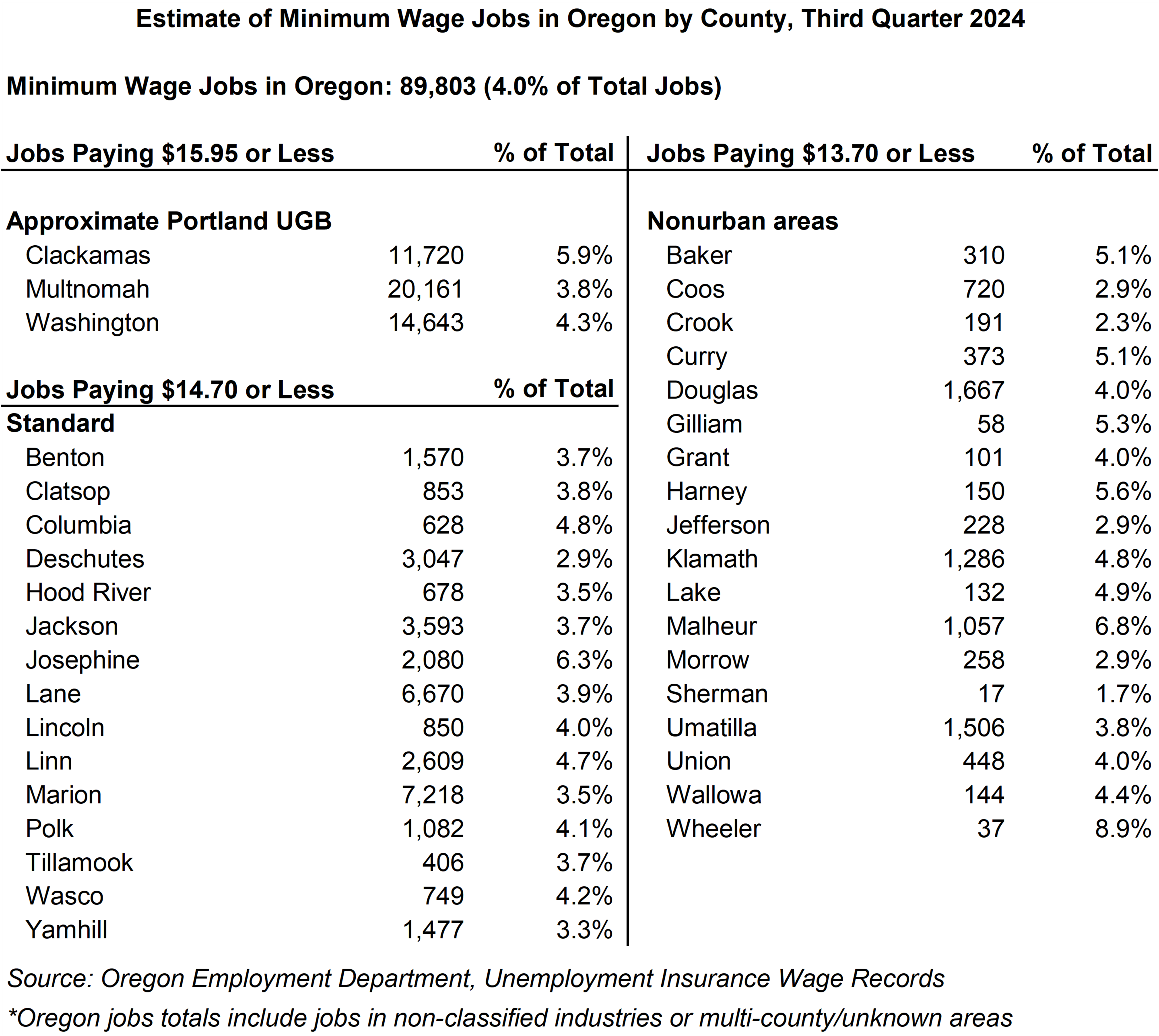 Table showing Estimate of Minimum Wage Jobs in Oregon by County, Third Quarter 2024