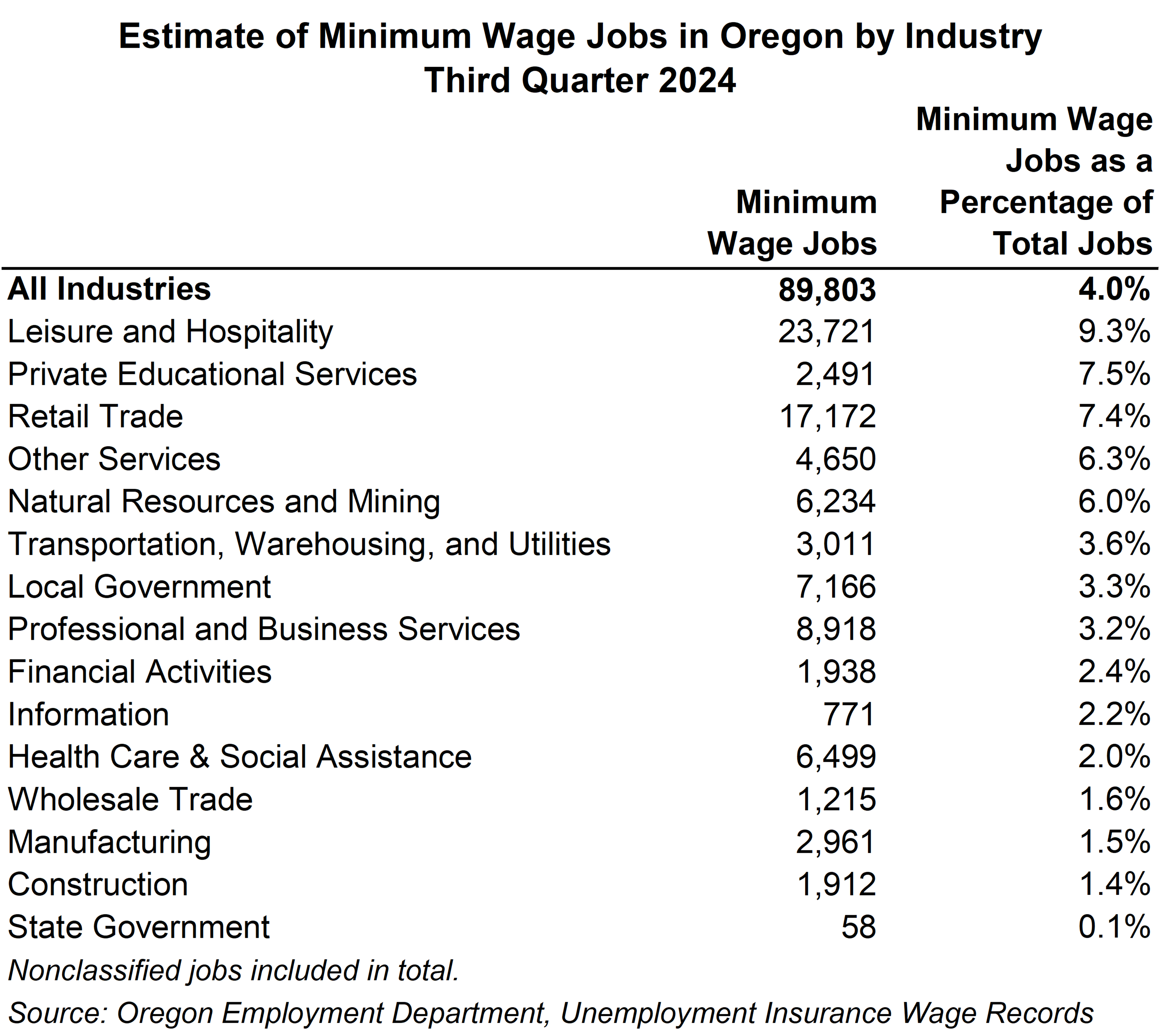 Table showing Estimate of Minimum Wage Jobs in Oregon by Industry, Third Quarter 2024