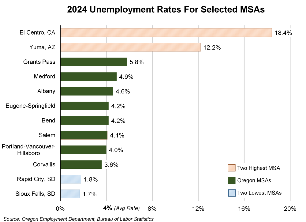 Grants Pass had the highest unemployment rate of Oregon’s MSAs at 5.8%, tying it for the 23rd highest rate in the nation with Decatur, Ill. and Las Vegas, Nev. Oregon’s Medford and Albany MSAs also had relatively high unemployment rates at 4.9% and 4.6%, respectively, placing them in the top 100 highest rates nationwide.