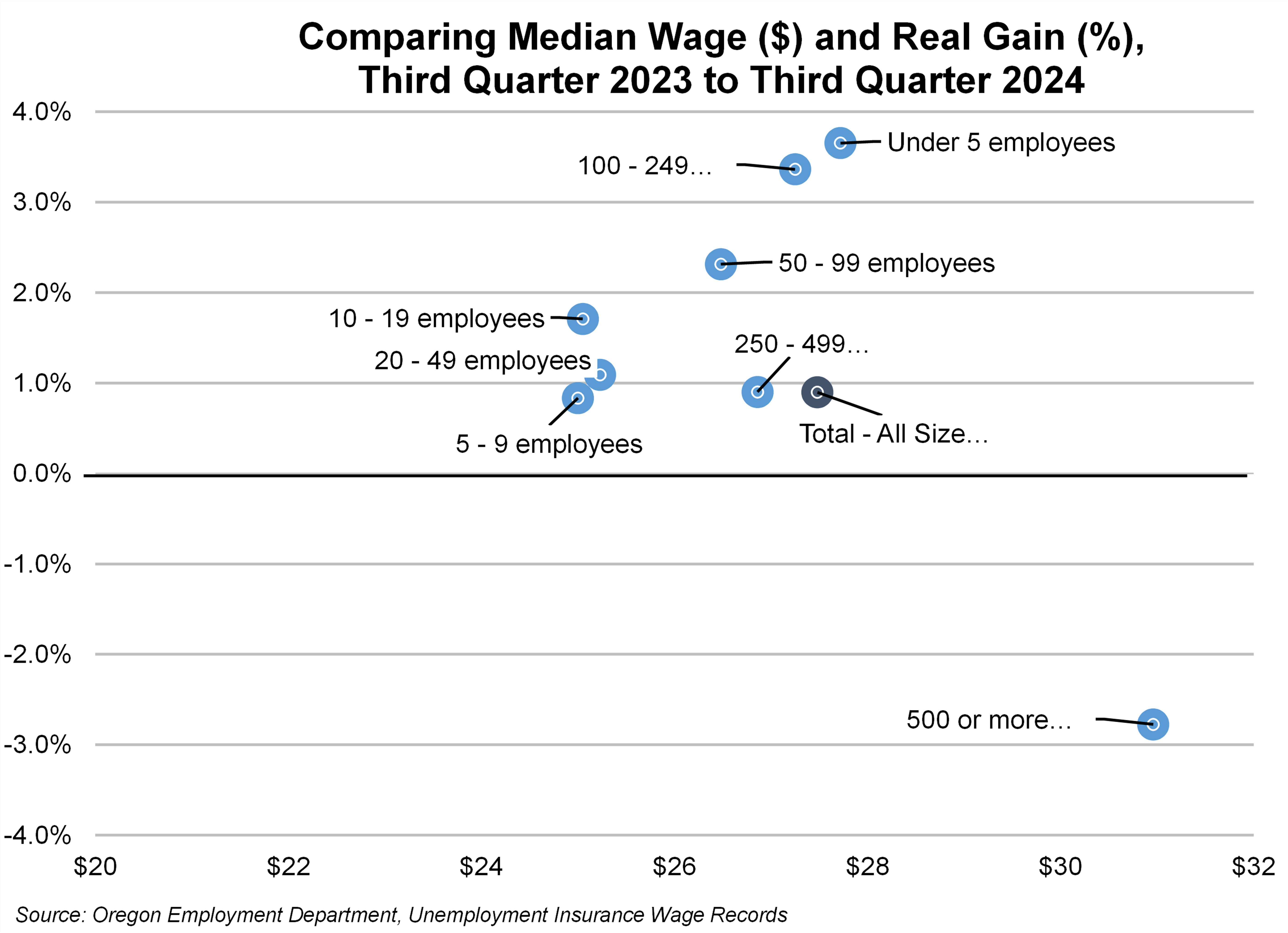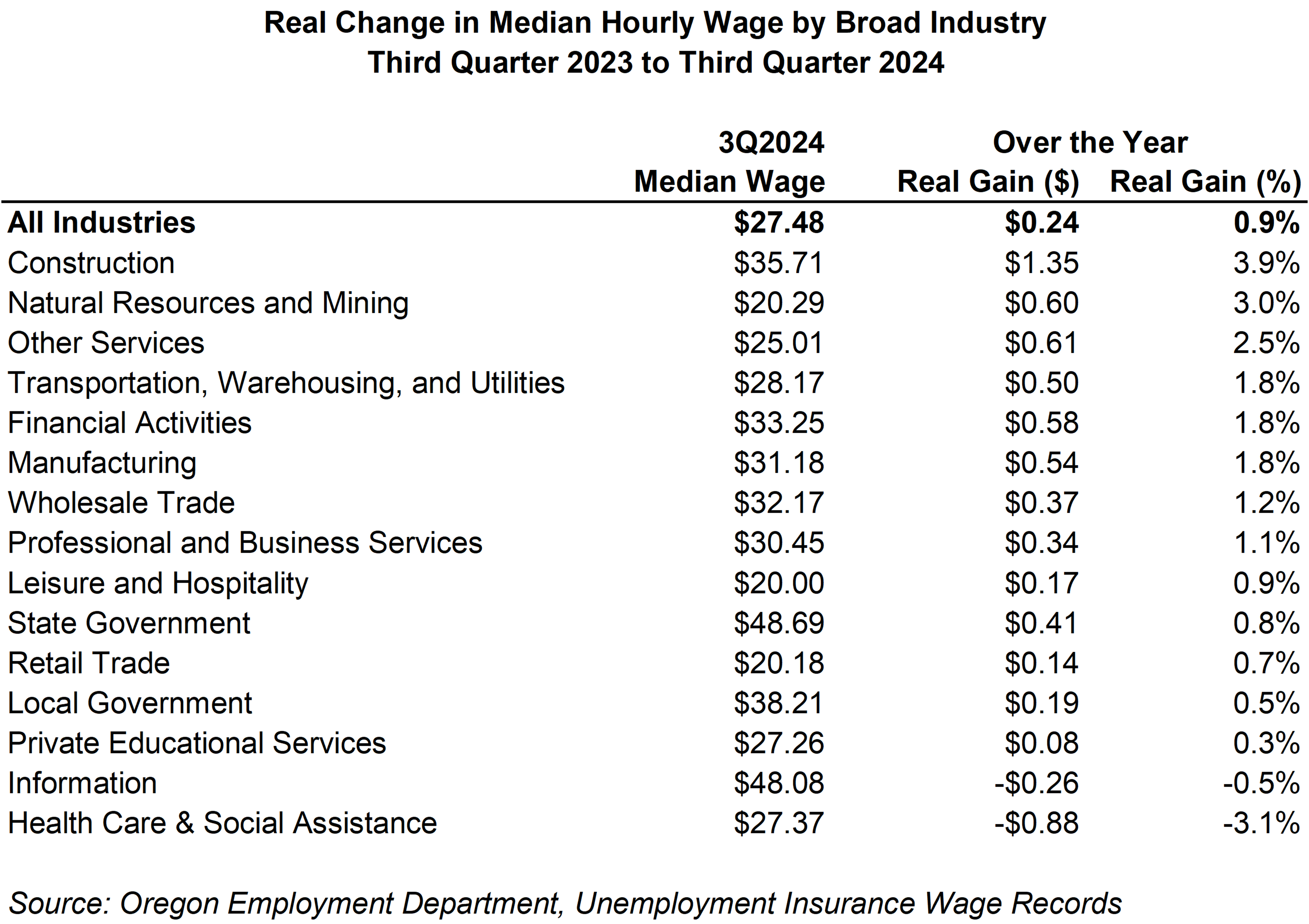 Oregon had 2.04 million people working in jobs covered by the state’s unemployment insurance system during the third quarter of 2024. This was a decrease of 9,500, or -0.5%, from the same quarter of the previous year. They earned a total of $33.7 billion, with an average wage of about $16,500 per worker for the quarter. The median hourly wage during the quarter was $27.48.
