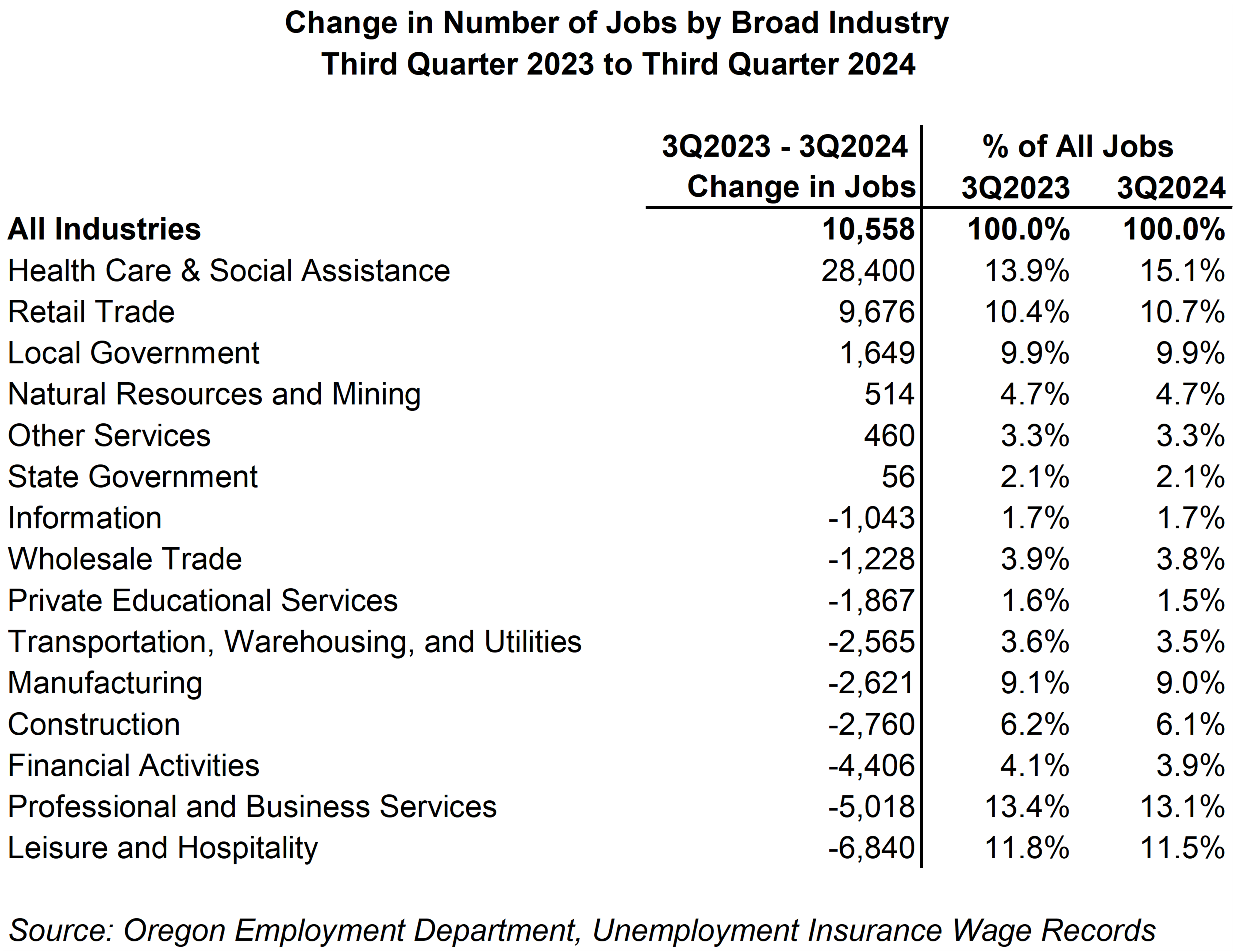Looking at the industries that gained jobs between third quarter 2023 and third quarter 2024, health care and social assistance made up the majority of those gains, accounting for 70% of job growth. Losses were spread over a number of industries over the past year.